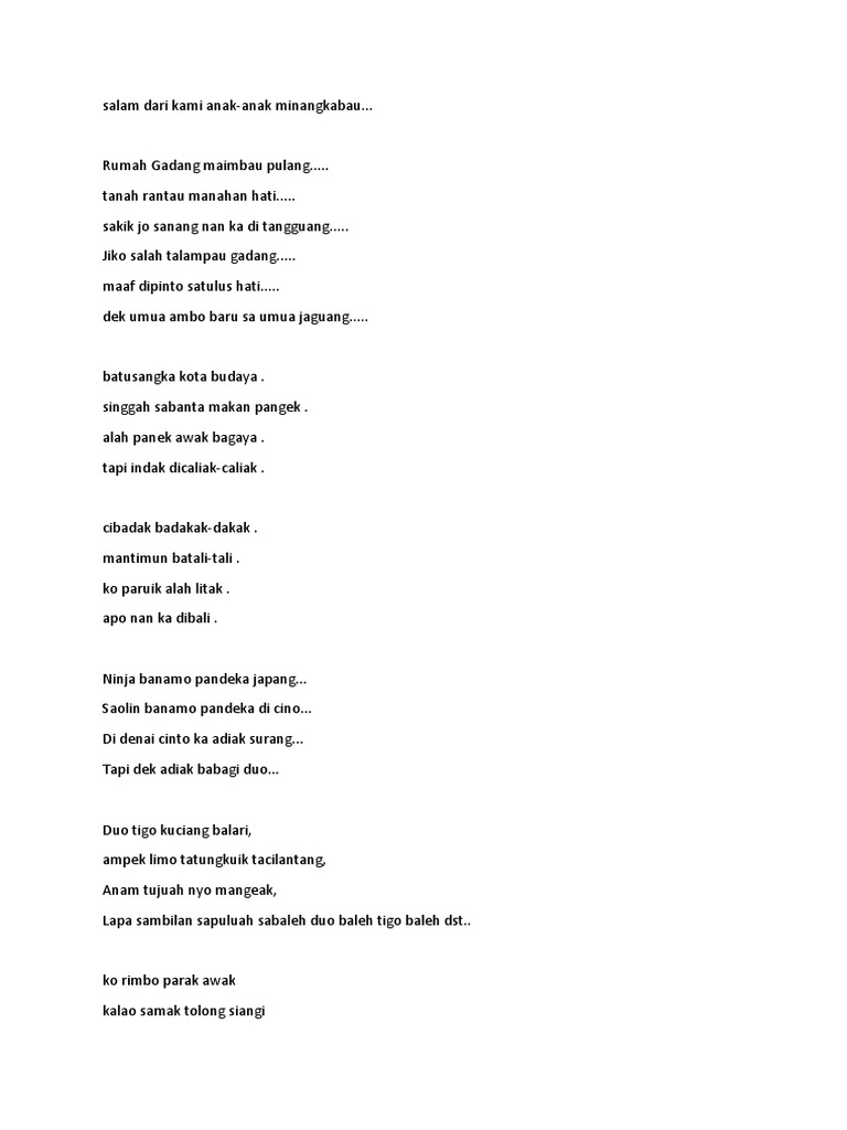 Minang dan Pantun tak dapat dipisahkan. Banyak cara yang dilakukan seseorang ketika ia ingin meminta maaf kepada orang lain mulai dari. Join Facebook to connect with Pantun Minang Putra Cinto and others you may know.
